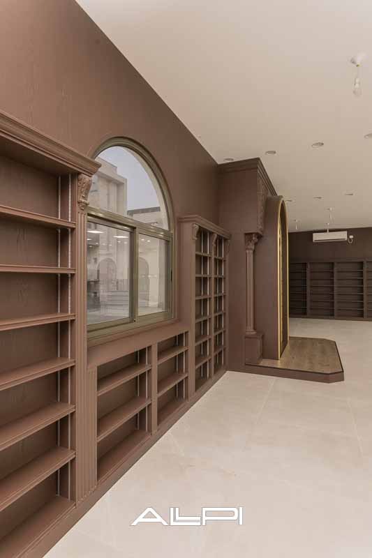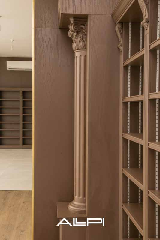 חיפויי קיר מהודרים – משולבים עם ספריות ענקיות המתנשאות לגובה עשרות מטרים, ליצירת חזות יוקרתית ומרשימה.
